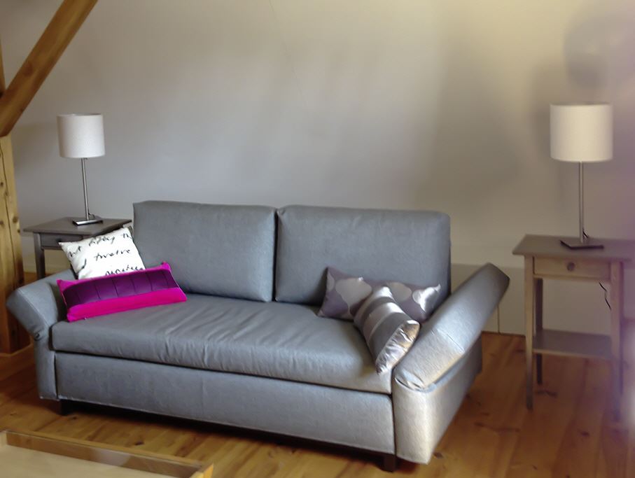 Im liebevoll ausgebauten Dachgeschoß befinden sich ein gemütlicher Wohnbereich mit Flachbild-TV und eine Schlafgelegenheit für zwei Personen.