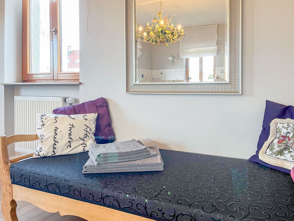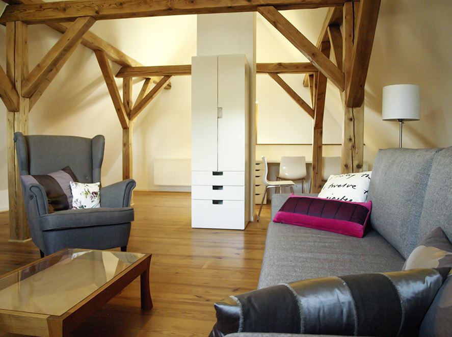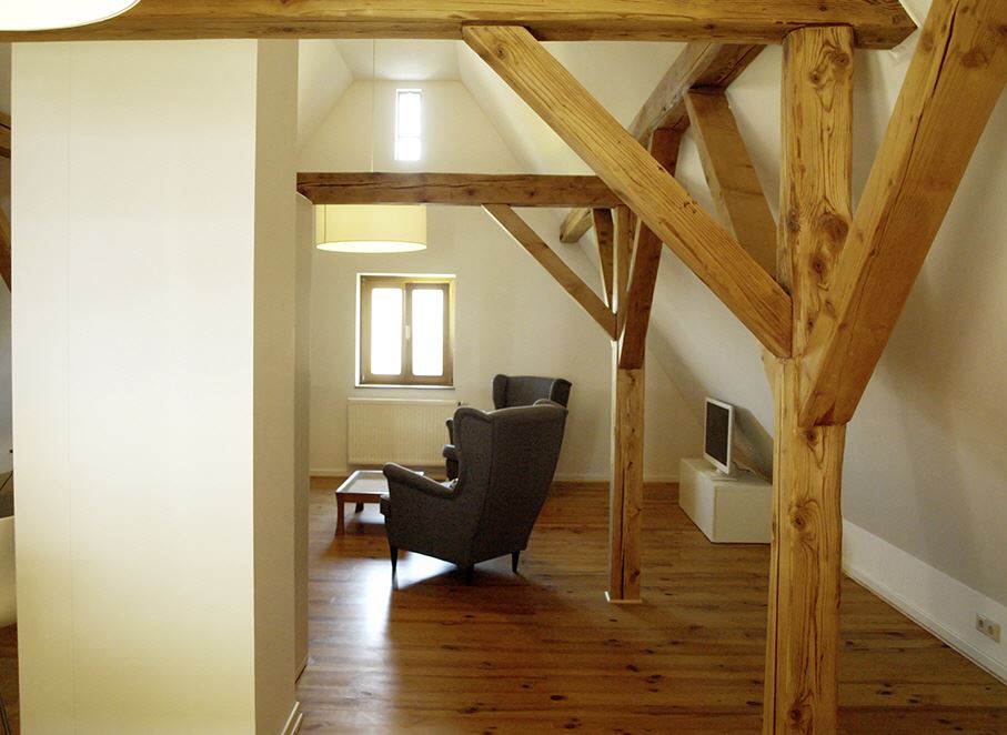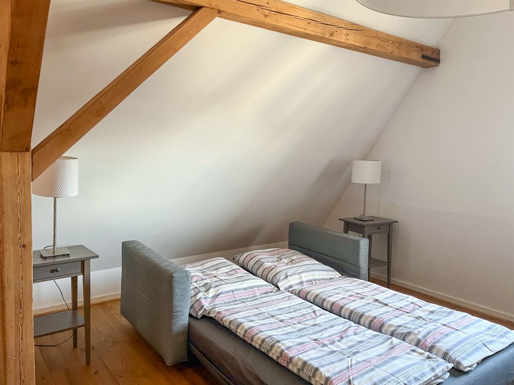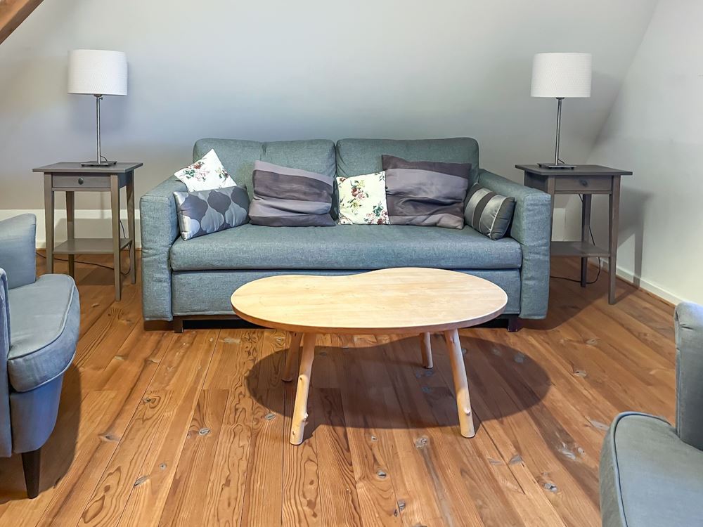 Im liebevoll ausgebauten Dachgeschoß befinden sich ein gemütlicher Wohnbereich mit Flachbild-TV und eine Schlafgelegenheit für zwei Personen.